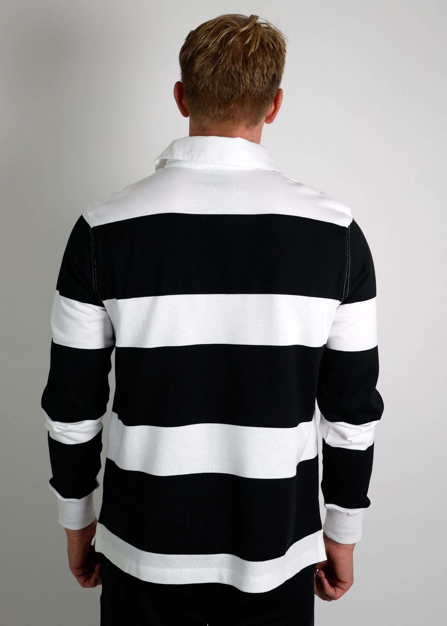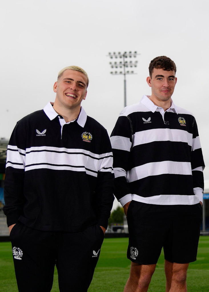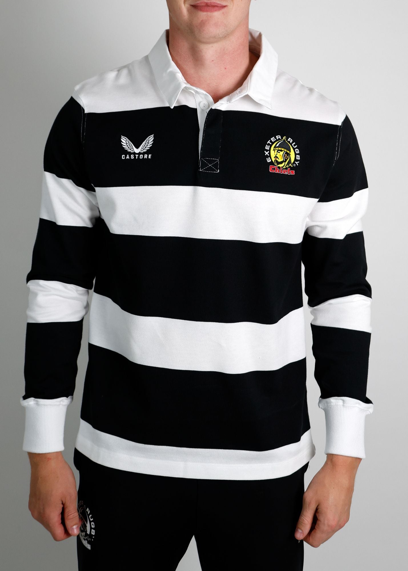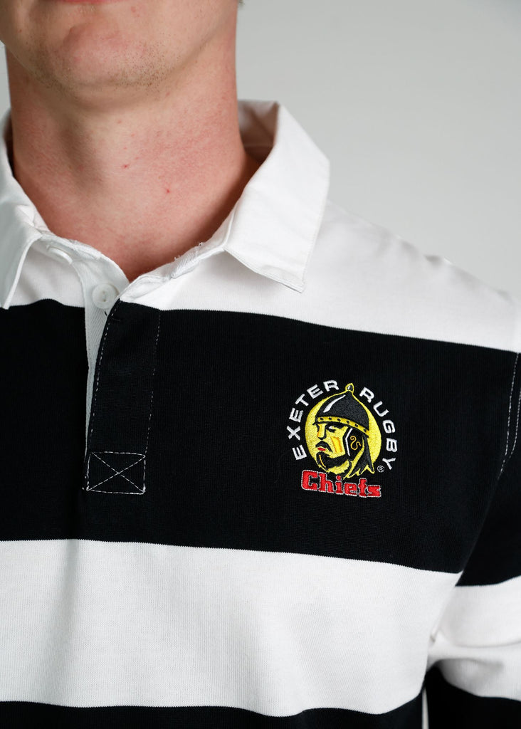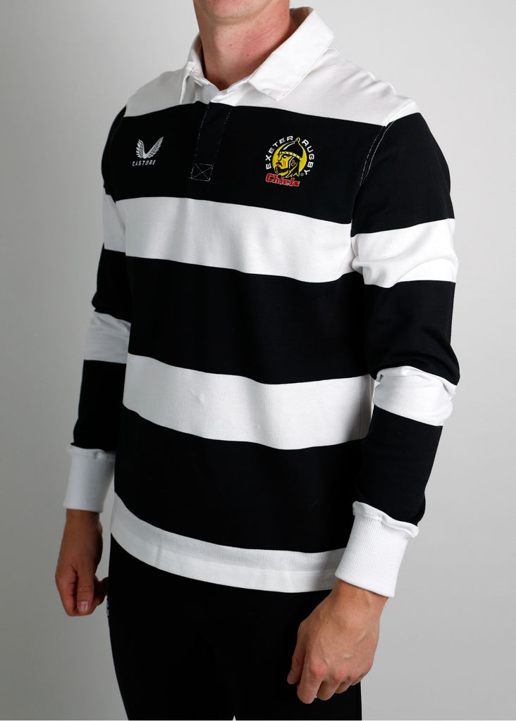 Stand out in this black and white striped Exeter Chiefs rugby jersey.